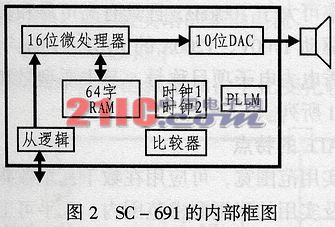 SC-691型语音和音乐合成芯片的电源电压(VDD)范围为3~5.2V,它的CPU时钟 fCPU范围为64~12320kHz,其DACP和DACM间的负荷电阻RDAC最小应大于32Ω。